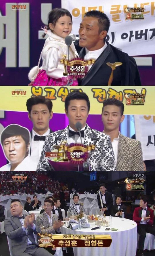 '2015 KBS 연예대상'에서 이종격투기 선수 추성훈과 개그맨 정형돈이 핫이슈 예능인상을 받았다.