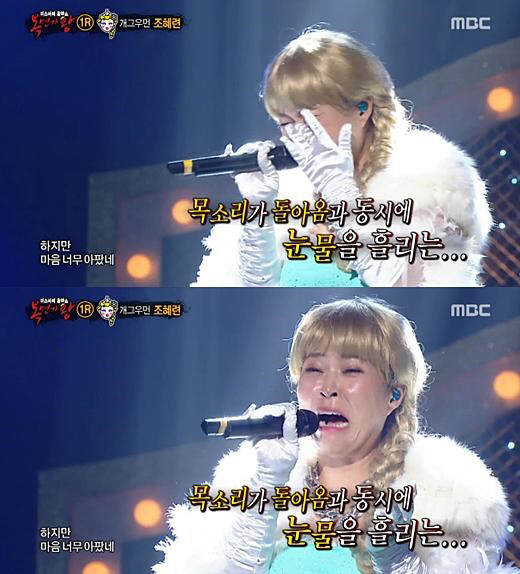 특히 가면을 벗은 조혜련은 자신의 목소리로 노래를 부르며 눈물을 펑펑 쏟아냈다. 이후 조혜련은 "나로 살고 싶다. 그런데 내 목소리로 부르면 당신들이 다 알 것 아니냐"라며 눈물을 흘린 이유를 밝혔다.