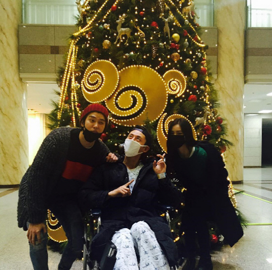 최근 수술을 하고 회복 중인 이지훈은 휠체어에 앉아 손가락으로 트리를 가르키고 있으며, 윤균상은 그의 어깨에 손을 올린 채 휠체어 높이를 맞추기 위해 긴 다리를 구부린 뒤 어정쩡한 포즈와 표정으로 보는 이들을 웃음짓게 하고 있다.