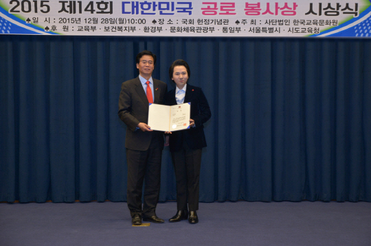 세계적인 팝페라테너 임형주(29, 로마시립예술대학 성악과 명예교수)가 지난 28일 오전 10시, 여의도 국회의사당 내 국회헌정기념관 대강당에서 개최된 '2015 제14회 대한민국 공로봉사상 시상식'에서 사회봉사대상 및 문화체육관광부장관상을 동시 수상했다.