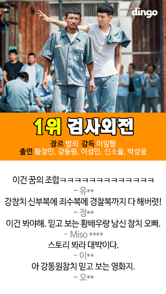 '검사외전'을 뽑은 누리꾼들은 "이건 꿈의 조합", "이건 봐야해. 믿고 보는 황배우랑 남신 참치 오빠", "스토리 봐라 대박이다" 등의 반응을 남기며 영화에 대한 기대감을 표현했다.