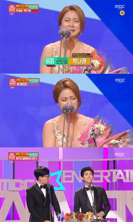 박나래는 무대 위로 올라와 "사실 내가 상이랑 잘 안어울리는 사람이다. 받아본 상이라고는 술상밖에 없는데 내가 MBC에서 상을 받는다"며 "먼저 집에 계신 가족에게 감사하고 감독님 감사하다. 친구들, 동료들 감사하다"고 눈물의 소감을 전했다.