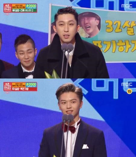 [스포츠조선닷컴 정유나 기자] 슬리피와 육성재가 버라이어티 부문 남자 신인상을 받았다.