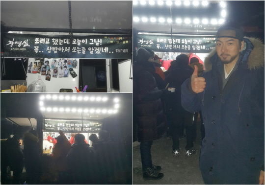 30일 송일국 공식 홈페이지에는 "쏘려고 했는데 오늘이 그날! 꼭 상 받아서 쏘는 줄 알겠네"라는 문구가 적힌 현수막 앞에서 미소 짓고 있는 송일국의 모습이 담긴 사진이 게재됐다. 송일국은 29일 '2015 KBS 연예대상' 우수상 수상을 기념하며 드라마 촬영현장에 야식차를 선물한 것. 이날 야식차에는 떡볶이 순대 튀김 어묵 등 각종 간식이 가득 채워져 있어 늦은 시간까지 촬영에 매진하는 스태프에게 에너지를 더했다는 후문.