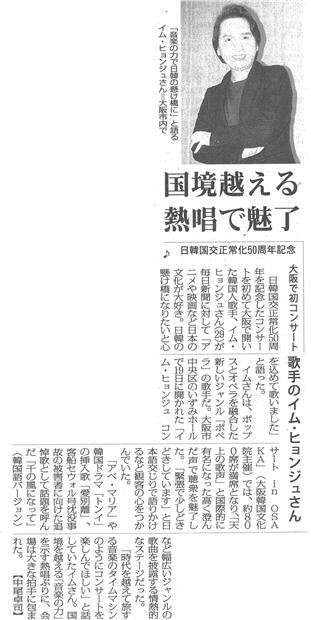 마이니치신문은 지난 23일자 조간지면 23면과 온라인을 통해 지난 19일 일본 오사카 이즈미홀에서 개최된 한일국교정상화 50주년 기념 임형주 오사카 독창회에 대한 공연리뷰 기사를 게재하며 크게 호평했다.