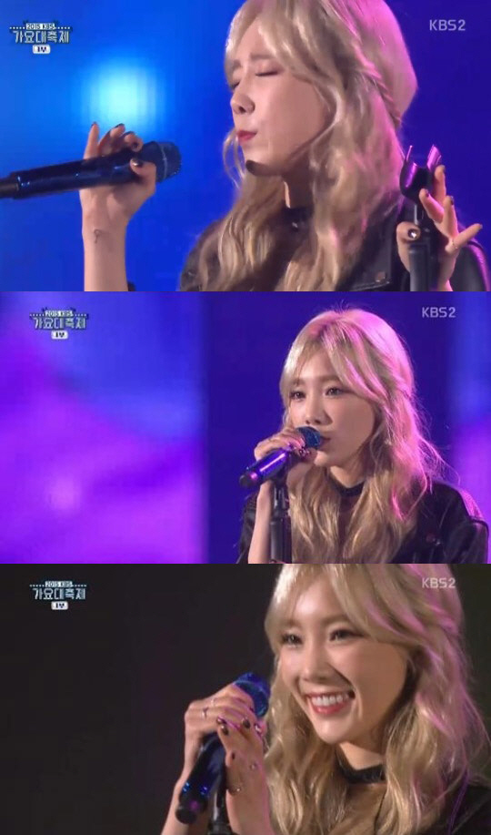 태연은 '아이(I)'를 청량한 목소리로 무대를 가득 채운 후 팬들에게 환한 미소를 지어 눈길을 끌었다.