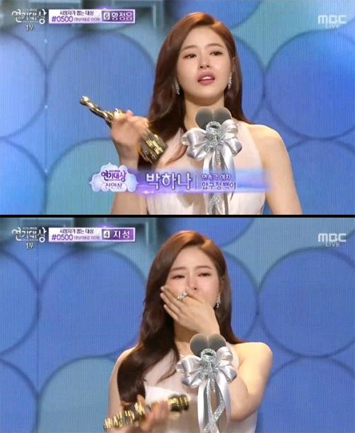 박하나는 무대에 올라오자마자 눈물을 흘렸다. 그는 "정말 받고 싶었다. 나에겐 대상이라고 생각하는 상이다. 무명인 나에게 이 자리까지 있게 해주신 임성한 작가님, 많이 가르쳐주신 감독님 감사드린다. 앞으로 열심히 연기하는 배우 되겠다"고 소감을 전했다.