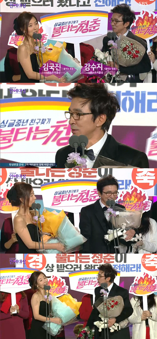 김국진과 강수지는 30일 오후 방송된 '2015 SAF(SBS Awards Festival) 연예대상'에서 베스트 커플상을 받았다. 김국진과 강수지는 '불타는 청춘'에서 '치와와 커플'로 시청자들에게 많은 사랑을 받았다.