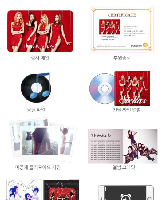1000원을 투자하면 감사 메일을 받게되고 1만원을 투자하면 감사메일, 후원증서, 음원파일을 받게 된다. 그렇게 액수별로 받게 되는 혜택이 달라지는데 최고액인 100만원의 경우 친필 사인 앨범, 미공개 친필 사인 폴라로이드 사진, 앨범 크레딧에 명예 제작자 이름 올리기, 비매품 사인 CD 증정, 펀딩 참여자 호명 모닝콜 파일, 스텔라와 함께하는 식사 미팅 등의 혜택이 주어진다.