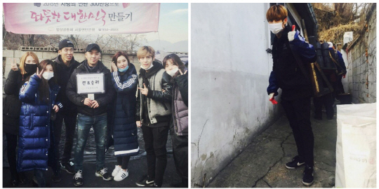수웅은 자신의 인스타그램을 통해 사진을 공개하며 "연말에 좋은 추억 감사합니다"라며 "봉사활동 같이하자, 대한민국 1도 올리기, 승리형 다음에 또 불러주세요"라고 전하며 작업용 목장갑과 연탄 운반용 지게를 짊어지고 있는 사진을 공개했다.