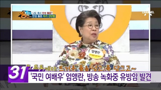 31일 채널A 관계자에 따르면 엄앵란은 고정 출연 중인 채널A 건강프로그램 '나는 몸신이다' 촬영 중 오른쪽 유방에서 악성 종양이 발견돼 유방암 확진 판정을 받았다.