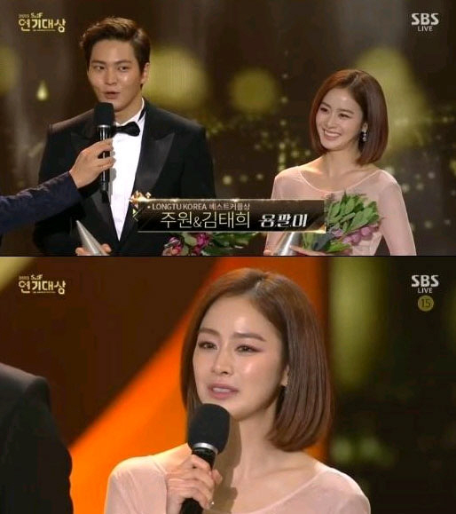 이어 김태희는 "이렇게 베스트커플상 예쁜 상 주셔서 감사드린다 드라마 촬영장에서 너무나 힘들고 고생하고 다들 여러 가지로 마음 고생도 많이 했는데 주원이가 든든하게 큰 힘이 돼줬다"며 "'용팔이' 사랑해 주신 분들 감사하다"고 했다.