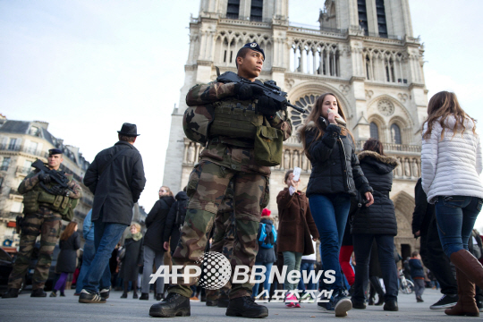 테러에 대비해 세계 주요도시들의 새해맞이 행사가 전격 취소됐다. 연말 프랑스 파리 노트르담 사원 앞을 지키는 군인들. ⓒAFPBBNews = News1