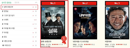 셜록:유령신부>가 개봉 당일 누적관객수 395,792명, 온라인 실시간 검색어 1위, 영진위, CGV, 롯데시네마, 메가박스에서 예매율 1위를 고수하며 새로운 흥행 강자로서의 입지를 다졌다. 영화 <
