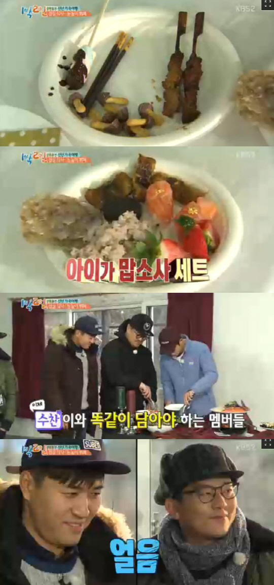 수찬이는 기다렸다는 듯 초코과자 앞으로 달려가 '1박2일' 멤버들의 마음을 애타게 만들었다. 많은 음식 중에 닭꼬치와 초코과자, 마시멜로를 고른 수찬이의 '족보 없는 메뉴'에 멤버들은 좌절했다.
