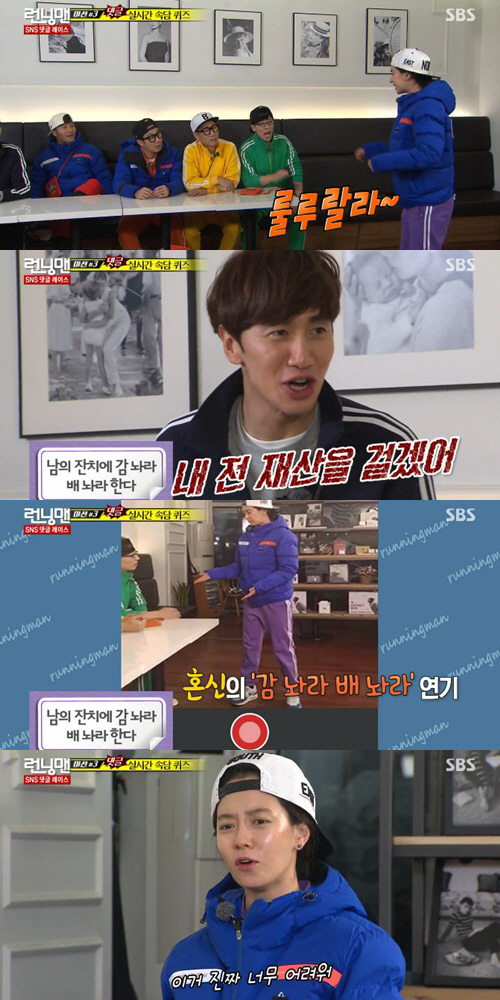 이날 송지효는 실시간 속담 퀴즈 미션에서 '남의 잔치에 감 놔라 배놔라 한다'를 10초 동안 네티즌들에게 몸으로 표현해야만 했다.