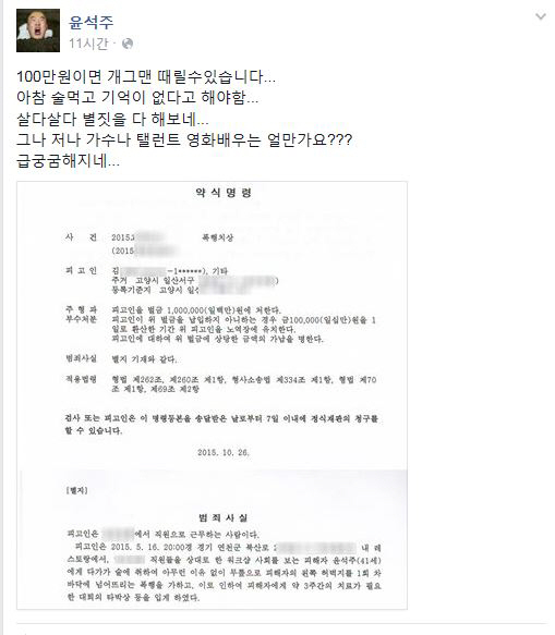 윤석주는 5일 자신의 페이스북을 통해 "100만 원이면 개그맨 때릴 수 있다. 아참 술먹고 기억이 없다고 해야한다. 살다살다 별짓을 다 해보네. 그나저나 가수나 탤런트 영화배우는 얼마인가요? 급 궁금해지네"라고 밝혔다. 이와 함께 법원으로 받은 약식 명령서도 게재했다. 이에 따르면 가해자는 술에 취해 한 레스토랑에서 워크숍 사회를 보던 윤석주를 폭행했다. 윤석주는 전치 3주의 상해를 입었다. 가해자는 벌금 100만 원을 선고 받았다. 윤석주는 이에 대한 불만을 토로한 것.