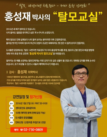 도서출판 운암이 오는 27일 서울 센터포인트 광화문타워에서 탈모치료 권위자인 홍성재 박사를 초청해 무료 강연회를 갖는다. 오후 7시30분부터 9시까지, 참여 인원은 50명이다. 홍성재 박사는 이날 탈모의 근본원인과 해결 방법에 대해 설명하고, 질의 응답 시간도 갖는다.