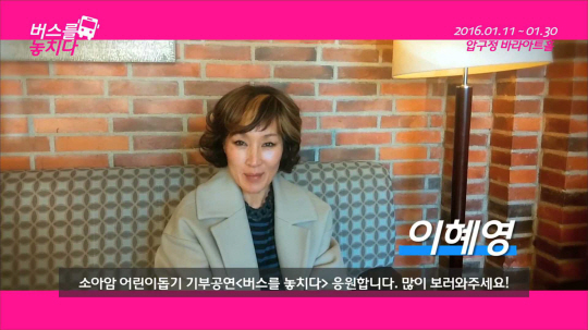 [스포츠조선 이유나 기자] 이혜영 이일화 최무성 심형탁 지창욱이 소아암어린이돕기를 위한 연극 '버스를 놓치다'를 응원하는 영상 메시지를 보냈다.