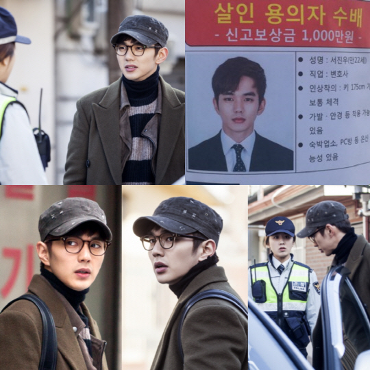 무엇보다 사람들의 눈을 피해 도망 다니고 있는 진우가 지명수배 전단지와는 180도 다른 모습으로 변장하고 나선 모습이 공개돼 시선을 집중시키고 있다. 변호사 진우는 평소 슈트를 말끔하게 차려입고 냉철한 눈빛을 하는 데 반해, 도망자 진우는 캐주얼한 복장에 모자를 푹 눌러쓰고 뿔테안경을 끼고 있어 수더분한 느낌을 풍기고 있는 것.