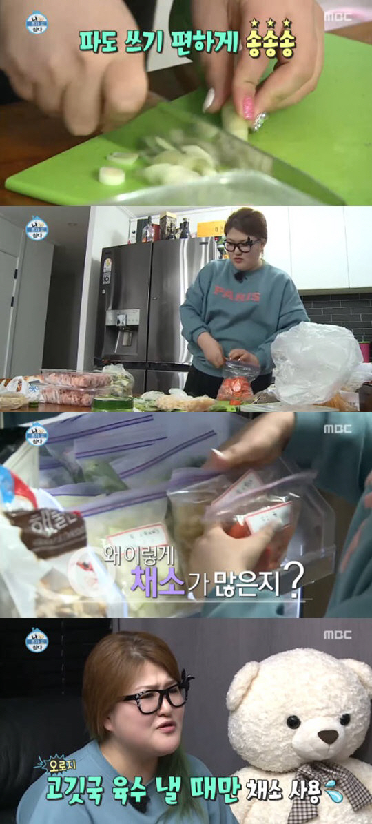 이후 정리를 마친 이국주는 뿌듯한 듯 미소를 지어보였다. 또한 사온 무를 썰어 냉동실에 넣었고, 냉동실 채소들로 가득차 있었다.