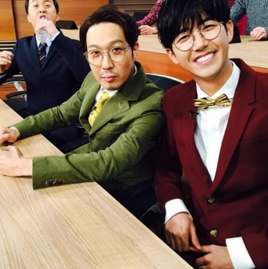 하하와 슈트차림 투샷으로 카메라를 바라보고 있고 그 뒤에서 정준하가 물을 마시고 있다.