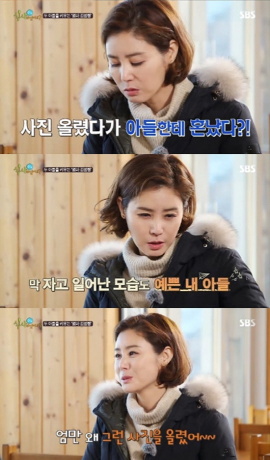 김성령은 "나는 내 아들이니까 막 자고 일어난 모습도 예뻐서 사진을 찍어서 올렸는데, 아들은 그걸 보고 '엄마는 왜 그런 사진을 올려'라고 하더라"며 "그러더니 나중에 미용실에서 머리를 자른 후 셀카를 찍더니 '엄마, 이 사진을 올려줘'라고 했다"고 말해 현장을 폭소케 했다.