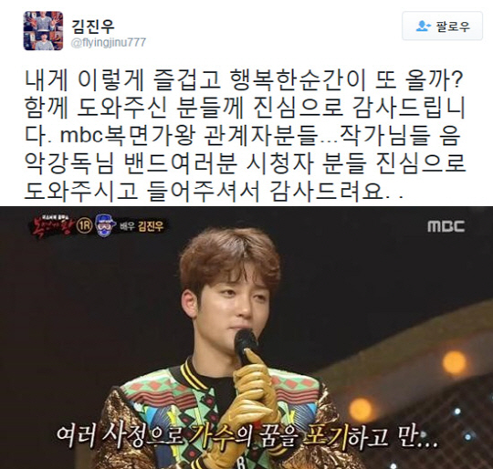 앞서 이날 방송된 MBC '복면가왕'에서는 김진우는 '소울충만 체키라웃' 가면을 쓰고 '경국지색 어우동'과 김돈규와 에스더의 '다시 태어나도'를 열창했다.