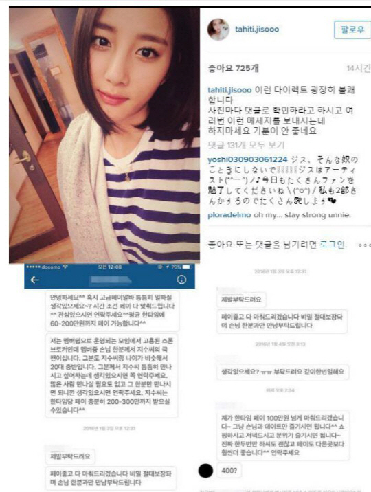 또 A씨는 지수로부터 답이 없자 "제발 부탁드린다. 페이좋고 다 맞춰드리겠다. 비밀 절대로 보장하고 손님 한 분과만 만남 부탁드린다"고 재차 메시지를 보냈다.