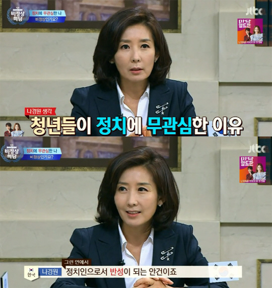 이날 나 의원은 '정치에 무관심한 나, 비정상인가?'라는 안건에 대해 "1차적 책임은 (정치인들인)우리한테 있다"고 말했다.