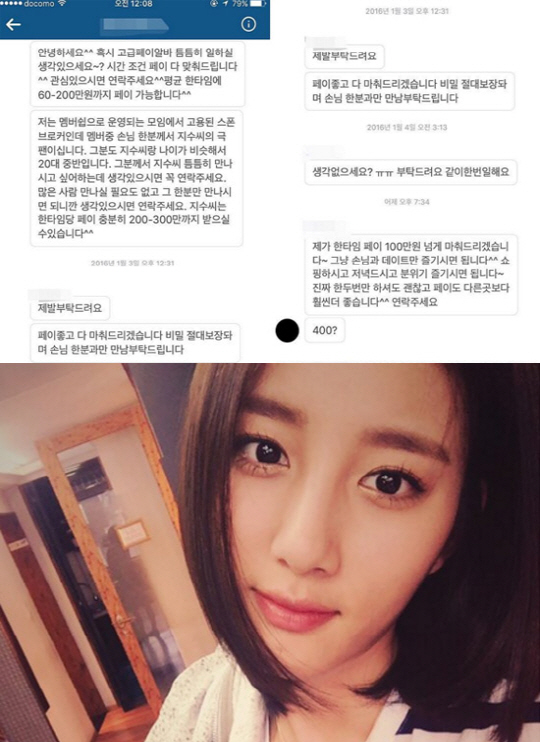 이어 "저는 멤버쉽으로 운영되는 모임에 고용된 스폰 브로커다. 손님 한분이 지수씨 극성팬이다. 나이는 20대 중반이다"며 "그분이 만나고 싶어한다. 지수씨는 한타임당 페이 충분히 200~300만원까지 받을 수 있다"고 제안했다.