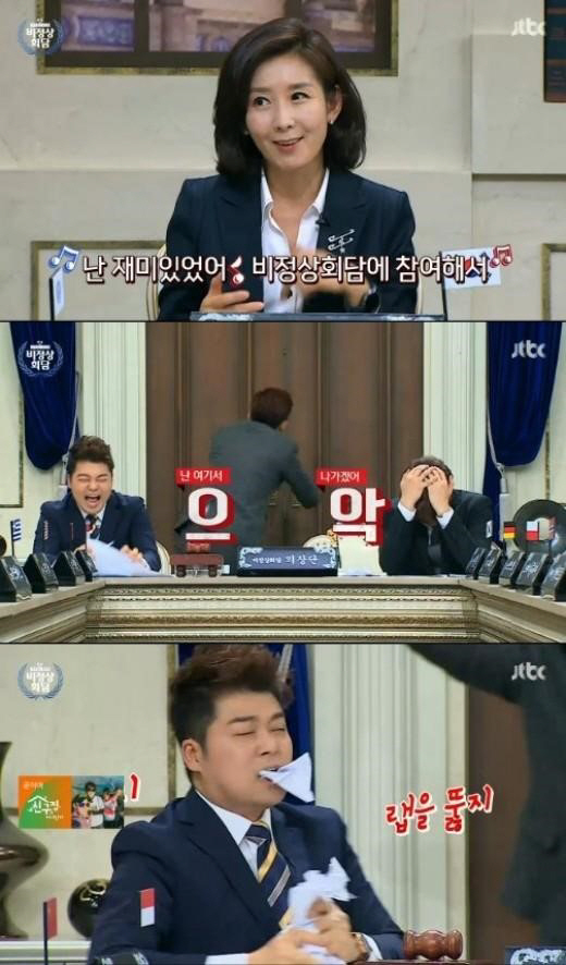 이에 MC들은 "개인기 어떡하실 거냐. 랩 뚫기라도 하실 거냐"고 물었고, 나경원은 "비정상회담에 출연한 느낌을 그 랩(Wrap)이 아닌 랩(Rap)으로 표현하겠다"며 힙합 제스처를 선보였다.