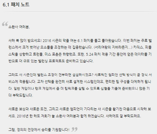 '6.1 패치 노트' 자세한 사항은 공식 홈페이지(leagueoflegends.co.kr)를 통해 확인할 수 있다. <스포츠조선닷컴>