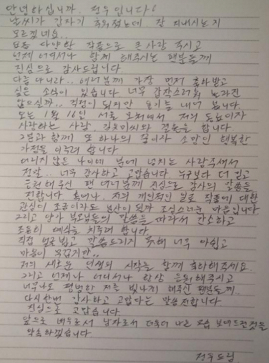 ‘진심 담았다’ 정우 자필편지 공개 “사랑하는 김유미와 결혼”