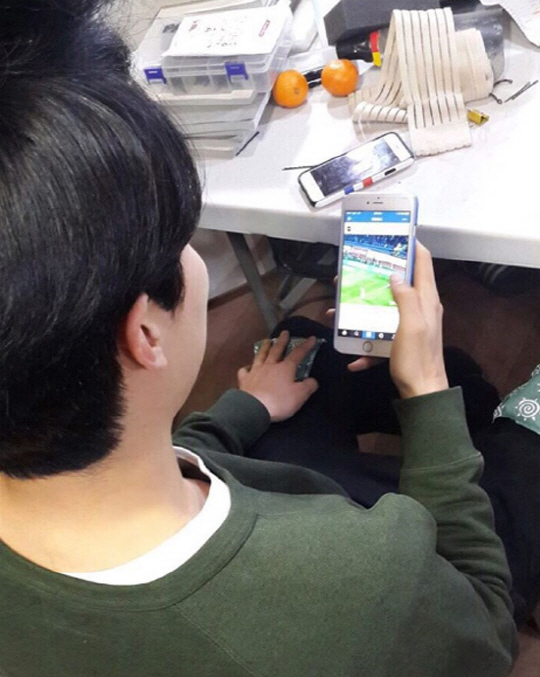 이어 편안한 차림의 류준열은 핸드폰으로 축구 경기 관람에 열중하고 있다.