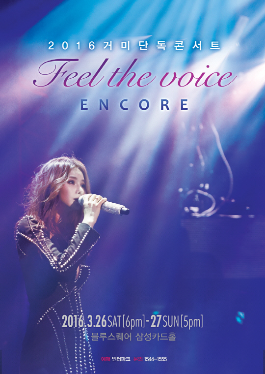 씨제스 엔터테인먼트는 "팬들의 뜨거운 호응에 힘입어 거미가 2016 전국 투어 콘서트 'Feel the Voice(필 더 보이스)'의 서울 앙코르 공연을 결정지었다. 오는 3월 26일과 27일, 양일간 블루스퀘어 삼성카드홀에서 펼쳐지는 이번 앙코르 콘서트는 이번 주 금요일(22일) 티켓 오픈을 가질 예정이다"라고 전했다.