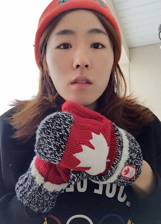 캐나다 국기가 그려진 벙어리 장갑을 낀 이상화는 다홍빛 모자로 깜찍함을 더했다.