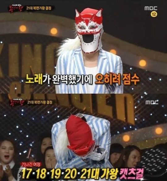 복면가왕 캣츠걸은 17일 방송된 '일밤-복면가왕'에서 파리 잡는 파리넬리 KCM을 꺾고 5연속 가왕(17, 18, 19, 20, 21대)에 등극, 김연우와 거미의 4연속 기록을 깨뜨렸다. 그는 자신의 이름이 호명되는 순간 고개를 숙이며 눈물을 흘렸다.