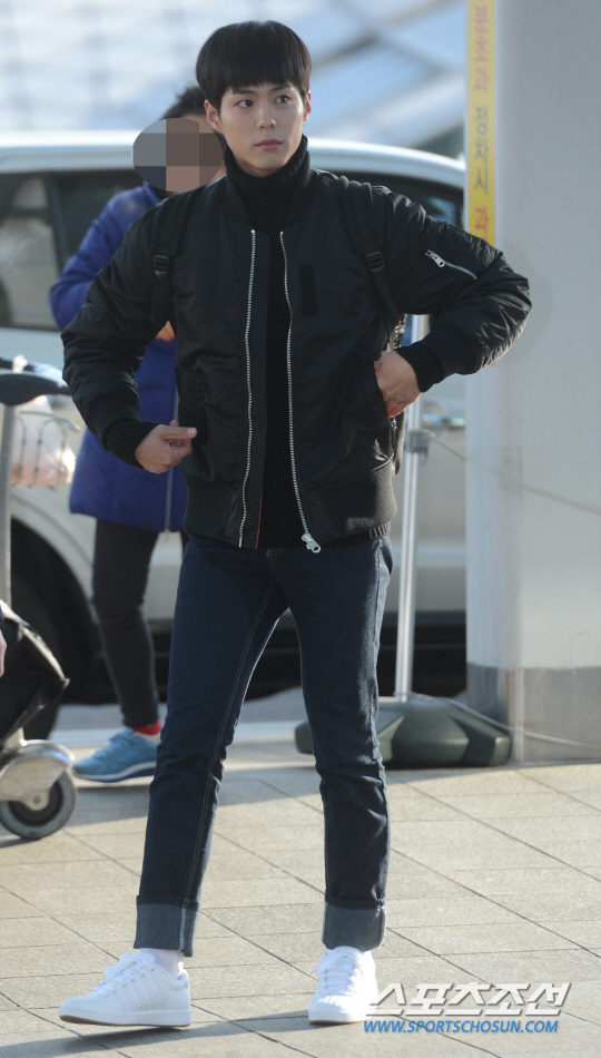 박보검은 광택나는 블랙 항공점퍼에 터틀넥 니트를 매치해 꾸민듯 꾸미지 않은 여행 룩을 선보였다. 짙은 컬러의 데님 진을 롤업해 박보검만의 귀여운 포인트를 살린 모습. 화이트 스니커즈가 깔끔한 외모를 더욱 빛내준다.