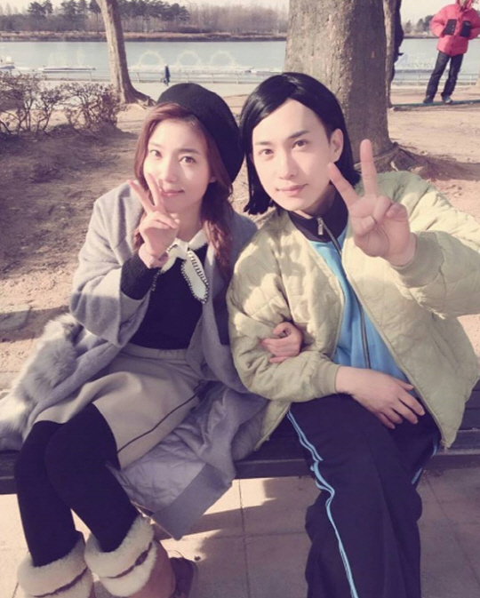 야외 촬영 중인 두 사람은 추운 날씨임에도 카메라를 향해 브이 포즈와 함께 환한 미소를 날리고 있다.