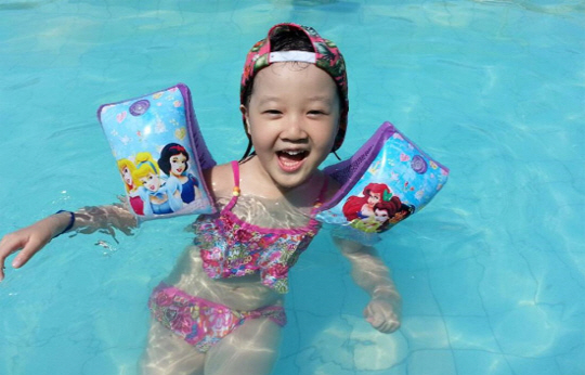 꽃무니 모자를 뒤집어 쓰고 꽃무늬 비키니 수영복 차림의 김설은 양 팔에 백설공주 튜브를 낀 채 물놀이 중이다.