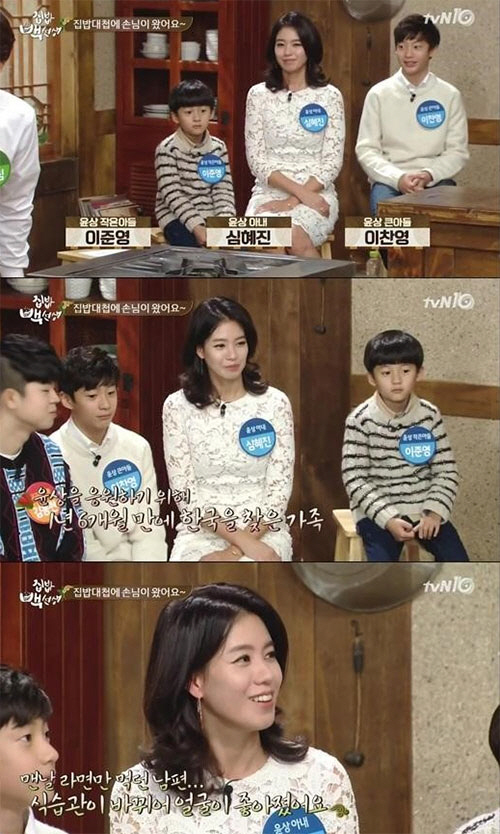 심혜진은 백종원에게 고마움을 전하며 "라면만 끓여먹던 남편 윤상이 '집밥 백선생' 이후 제대로 된 밥을 차려 먹는다. 얼굴이 무척 좋아졌다"고 말했다. <스포츠조선닷컴>