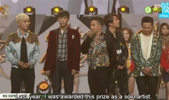 대상을 차지한 빅뱅은 수상 소감으로 "완전체로 1년 정도 시간이 남은 것 같다"며 "매번 남다른 사랑에 감사드린다. 앨범 작업을 빨리 마무리해서 여러분 앞에 선보이겠다"는 소감을 밝혔다. 이에 멤버들의 군 입대를 간접적으로 언급해 눈길을 끌었다.
