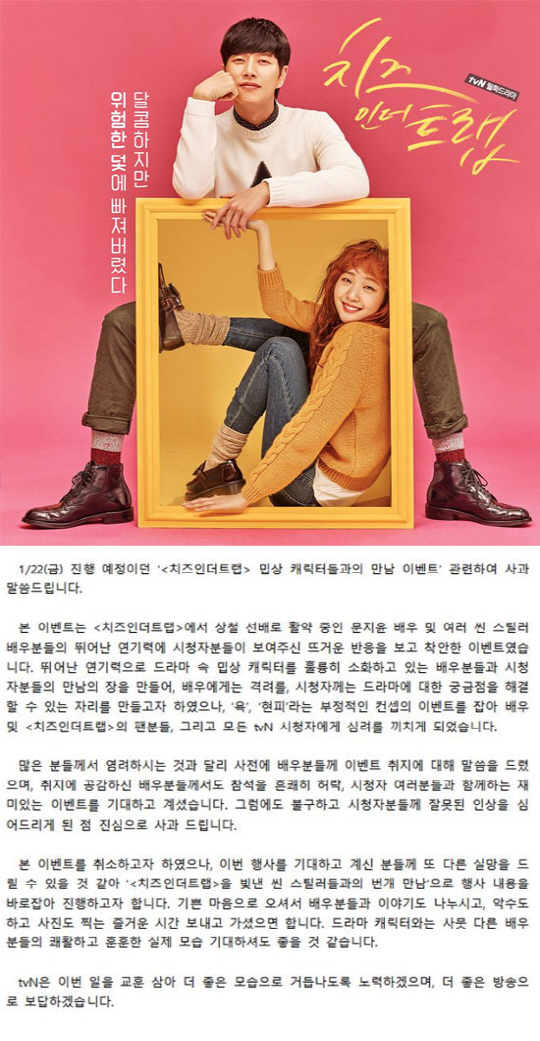 "밉상 캐릭터들과의 만남 이벤트 관련하여 사과 말씀드립니다"라고 운을 뗀 '치즈인더트랩' 측은 "본 이벤트는 '치즈인더트랩'에서 상철 선배로 활약 중인 문지윤 배우 및 여러 씬 스틸러 배우분들의 뒤어난 연기력에 시청자분들이 보여주신 뜨거운 반응을 보고 착안했다"고 해명했다.