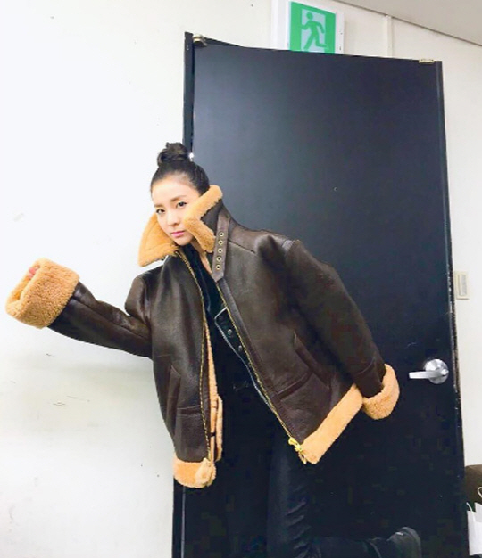 이어 본인 몸집보다 큰 가죽 점퍼 차림의 산다라박은 문 앞에 서서 한쪽 팔과 다리를 든 채 마치 움직이는 듯한 시늉을 하고 있다.