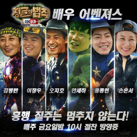 영화 '어벤져스' 포스터에 합성된 이 이미지에는 '영원한 국민 족장' 김병만은 물론, '정글 추노! 부족장' 오지호, '인간 연장' 이장우, '안 스틸러' 안세하, '정글 캔디녀' 손은서, '여심 저격 완료! 홍기심' 홍종현 등 정글에서 보여주고 있는 각양각색의 매력이 재치 있게 담겨 웃음을 유발한다.