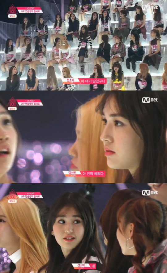 연습생 전소미가 '프로듀스101'에 등장하자 다른 연습생들이 그의 미모에 감탄했다.