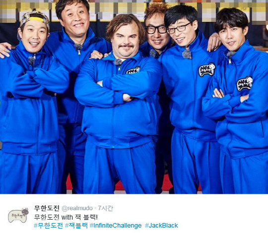 23일 '무한도전' 공식 SNS에는 "무한도전 with 잭블랙"이라는 글과 함께 파란색 운동복을 입은 멤버들과 잭 블랙의 사진을 게재했다.
