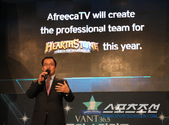 아프리카TV 서수길 대표가 23일 '대국민 스타리그' 결승전에 앞서 '스타크래프트2'팀과 '하스스톤'팀의 창단 계획을 설명하고 있다.
