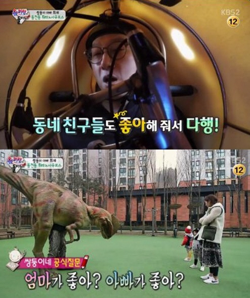 또 이휘재는 공룡 분장을 한 채 "엄마가 좋아? 아빠가 좋아?"를 연발해 모두를 폭소케 했다.narusi@sportschosun